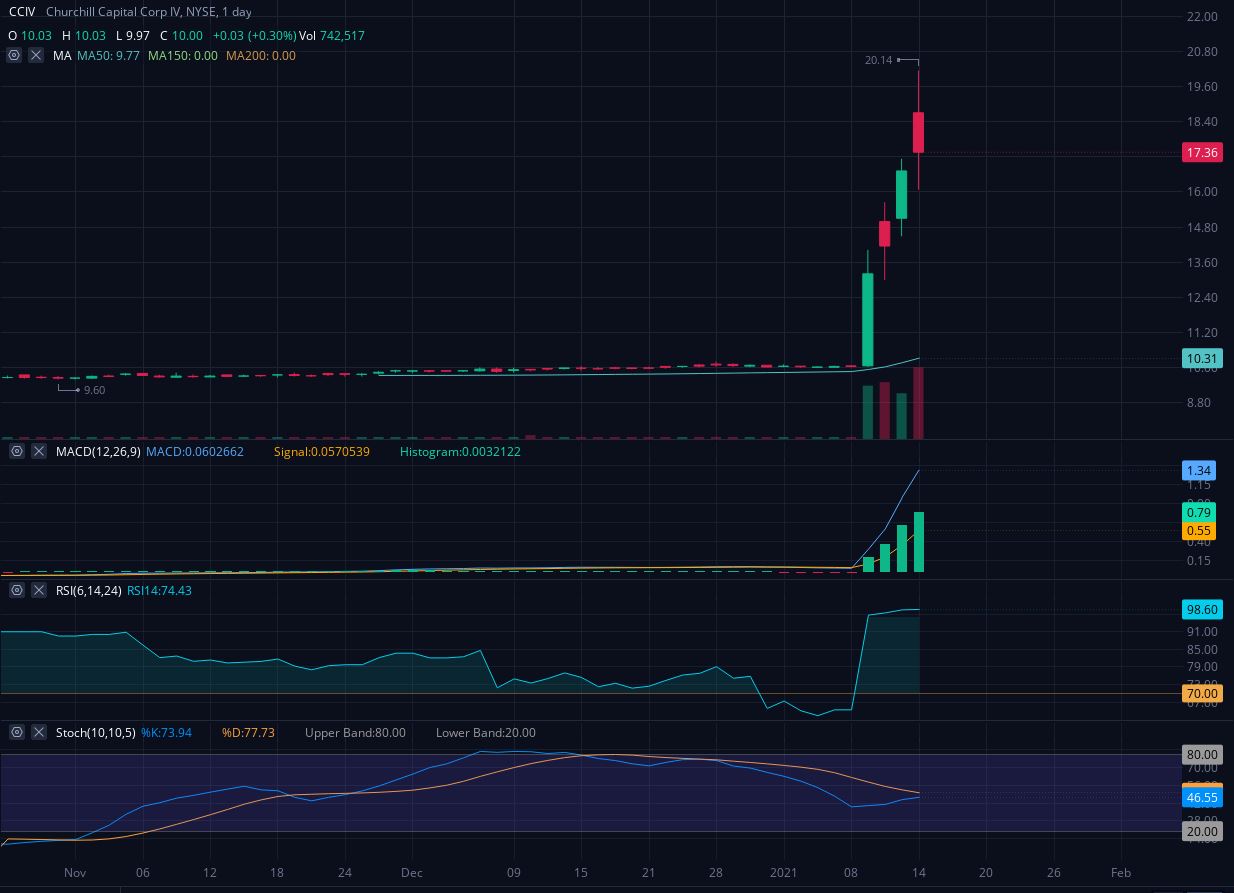 Churchill Capital Corp IV 혹은 CCIV 주가는 약 4일 동안 80% 급등하였습니다. 보통 SPAC은 상장 가격이 $10 달러로 형상되는데 목요일에도 약 3.83% 상승하며 CCIV 주가는 $17.36 달러에 장을 마감하였습니다.