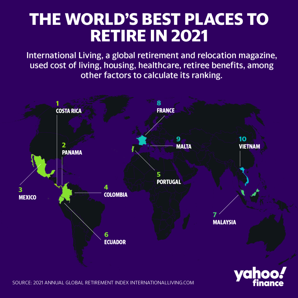 최근 야후 파이넨스에서 세계에서 은퇴 후 가장 살기 좋은 나라 10곳을 발표했습니다. 순위 선정에는 집값, 은퇴 후 혜택, 비자, 날씨, 정부, 기회, 건강복지, 거주비용, 개발, 엔터테인 등을 고려해 선정되었으며 이 데이터를 이용 세계에서 은퇴 후 살기 좋은 곳 10곳을 선정하였습니다.