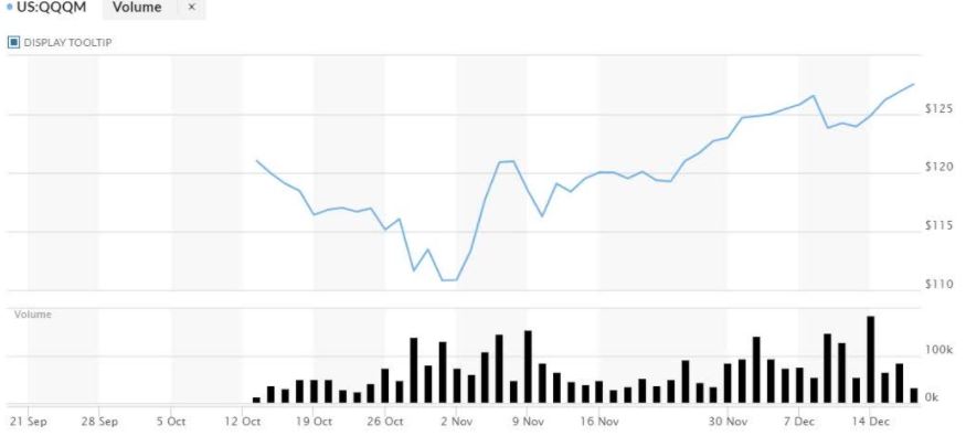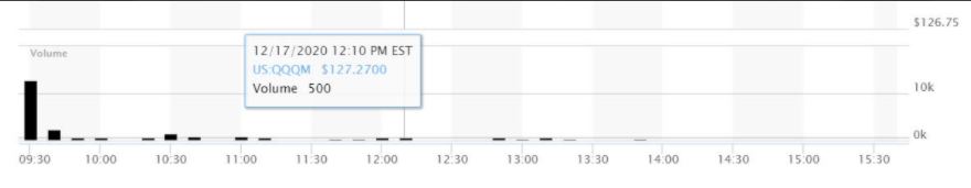 QQQM ETF는 QQQ와 비교 상당의 낮은 거래량을 보여주고 있습니다. 약 30일동안 QQQM은 78572 주가 거래되었고 아래의 QQQM 거래량을 보면 특정할 날 거래량이 상승한 날들이 평균 거래량을 높여 줬으며 보다 많은 날들이 거래량은 상당히 낮게 보이고 있습니다. 2020년 11월 9일에 153987 주식이 거래량을 기록하고 12월 14일에는 184093 거래량을 기록 하지만 다음날에는 64293 거래량을 QQQM의 거래량은 큰 폭으로 떨어졌습니다.