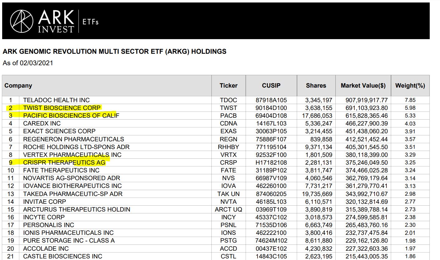 저는 개인적으로 바이오 쪽이나 헬스케어 쪽 관련해서는 제가 익숙하지 않고 또 공부하려고 해도 워낙 그쪽 분야에 잘 모르다 보니 투자는 잘하지 않는 편이긴 한데 모두 다 잘 알고 계시겠지만 ARK INVEST의 캐시 우드가 지노믹스 / 유전체학에 분야에 대해서 지속적으로 높게 평가하고 앞으로 10년 동안 전기차 분야보다 성장 가능성이 높다라고 밝혔왔기 때문에 23 andME가 VGAC와의 합병 후 캐시 우드의 ARKG에 편입될 가능성을 염두에 두고 관심 있게 지켜봐 보려고 합니다.