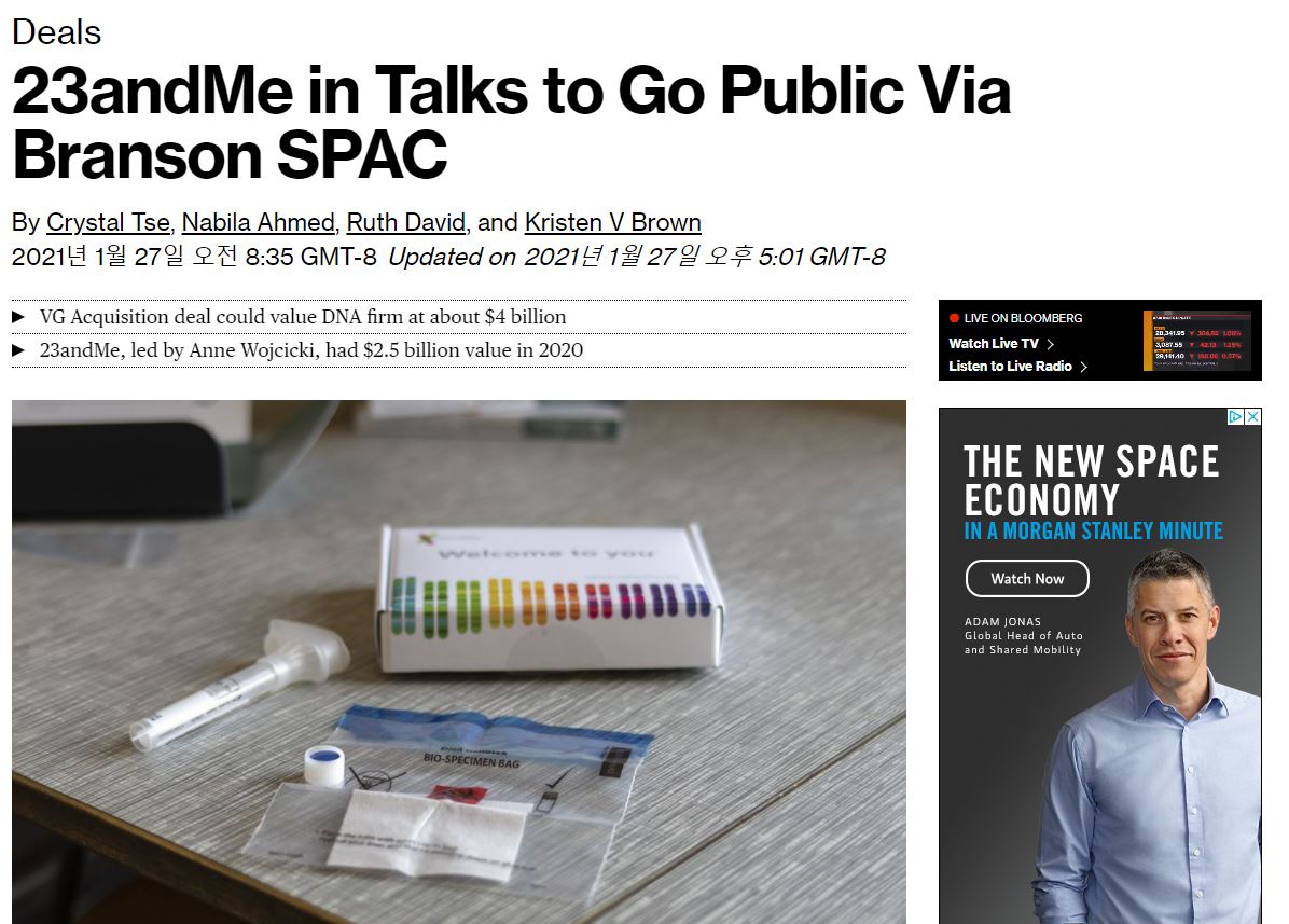 1월 27일 블룸버그 기사에서 23ANDME와 합병 관련 기사가 나온 VGAC 스팩에 대해 이야기해보려고 합니다. 23andME라는 기업은 약 10 밀리언의 사람 디엔에의 데이터를 보유하고 있으며 이를 통해 획기적인 약을 만드는 기업이라고 알려져 있습니다.