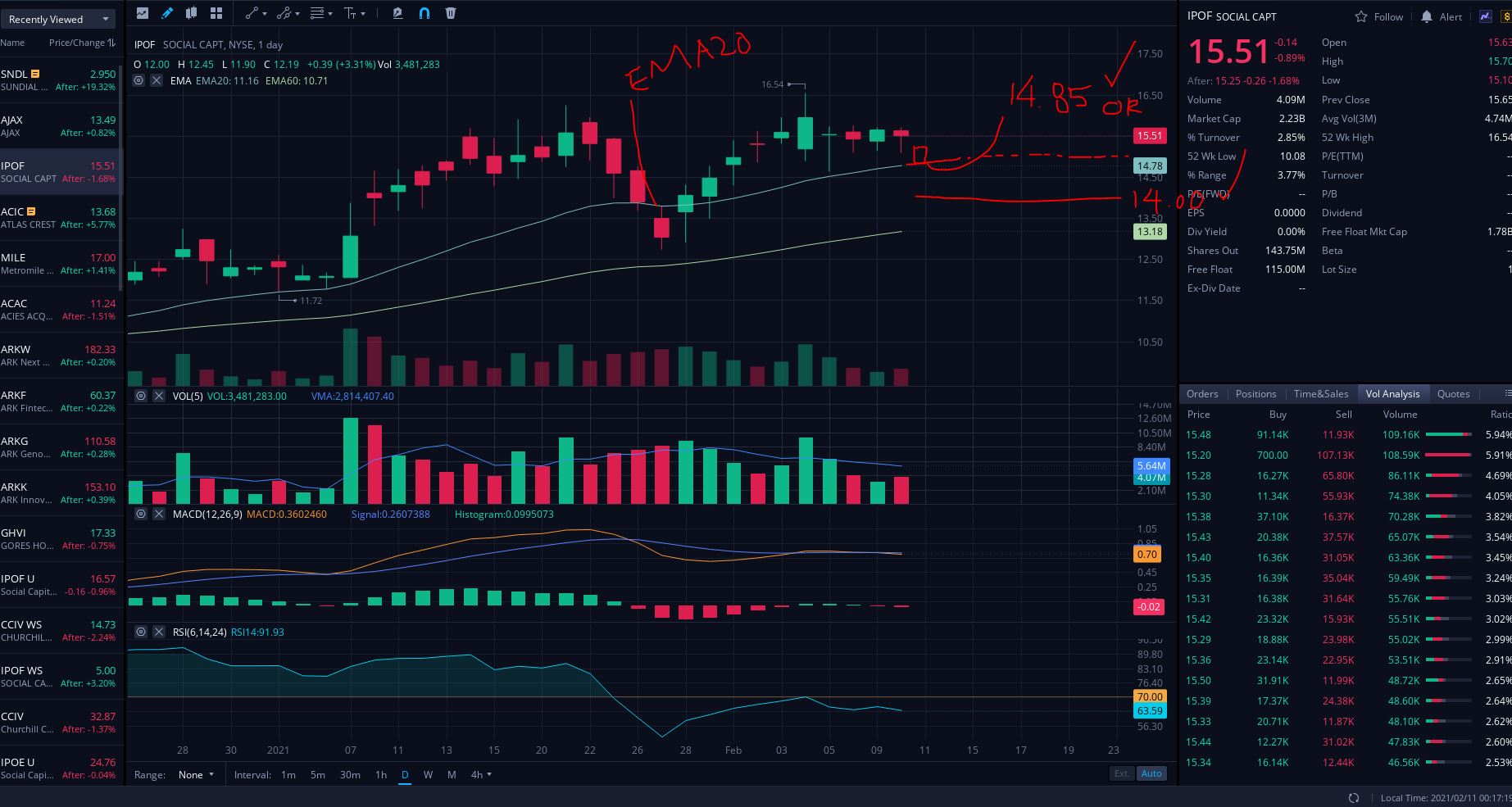 모두가 알다 싶히 차마스는 스팩에 관련해 최고 전문가로 알려져 있으며 그동안 과거의 자신의 스팩을 기업과 합병해 성공적으로 상장시켰으며 최근에는 IPOE와 SOFI의 합병을 이끌어 내기도 했기 때문에 그의 리더쉽 그리고 스팩으로 보여준 그의 과거의 성과를 보면 그의 여섯 번째 스팩인 IPOF도 좋은 기업을 찾아 성공적으로 합병시킬 수 있을 거라 생각합니다. 마지막으로 고려해볼 상항은 현재 IPOF의 주가로 최근 조금 빠지긴 했지만 여전히 높은 프리미엄이 붙은 가격이라 생각되는 주가이긴 합니다. 보통 스팩에서 합병 루머 없이 $10 - $12대가 안정적인 투자선이라 생각하기 때문에 IPOF의 주가가 $14대까지 내려오거나 ema 20 선으로 내려올 때까지 투자 시기를 기다리거나 selling put option으로 받는 프리미엄을 이용해 주가 평단을 전체적으로 낮추는 방법으로 매수하는 방법 혹은 적당한 시기에 call option으로 접근하는 방법도 고려되고 있습니다. 물론 이는 저의 개인적인 투자 방법이며 저는 투자 전문가가 다시 한번 아님을 말씀드리며 자신의 투자 방법에 맞는 투자 방법으로 접근을 해야 하겠습니다.
