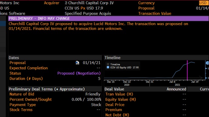 우선 처음에 우리에게 알려진 블룸버그 터미널의 정보로는 1월14일 CCIV가 루시드 합병에 대해서 제안 (PROPOSED: NEGOTITATION)을 하였다는 정보와 임시 거래 조건에서는 입찰의 성격으로는 FRIENDLY로 되어있으며 지불 유형으로는 주식으로 되어있었던 기존의 정보가 오늘 블룸버그 터미널에서 날짜는 1월 14일에서 1월 11일 바뀌었고 CCIV가 루시드를 합병 제안했다는 정보는 ㅍVenrock 곳에서 CCIV에 자신들이 홀딩하고 있는 루시드의 포지션에 대해 매도 제안을(PROPOSED: ON THE BLOCK: OFFER FOR SALE) 했다라고 바뀌었으며 입찰의 성격은 FRIENDRY에서 조건없음 그리고 지불 유형은 주식에서 현금으로 바뀌었다고 알려져 있습니다.