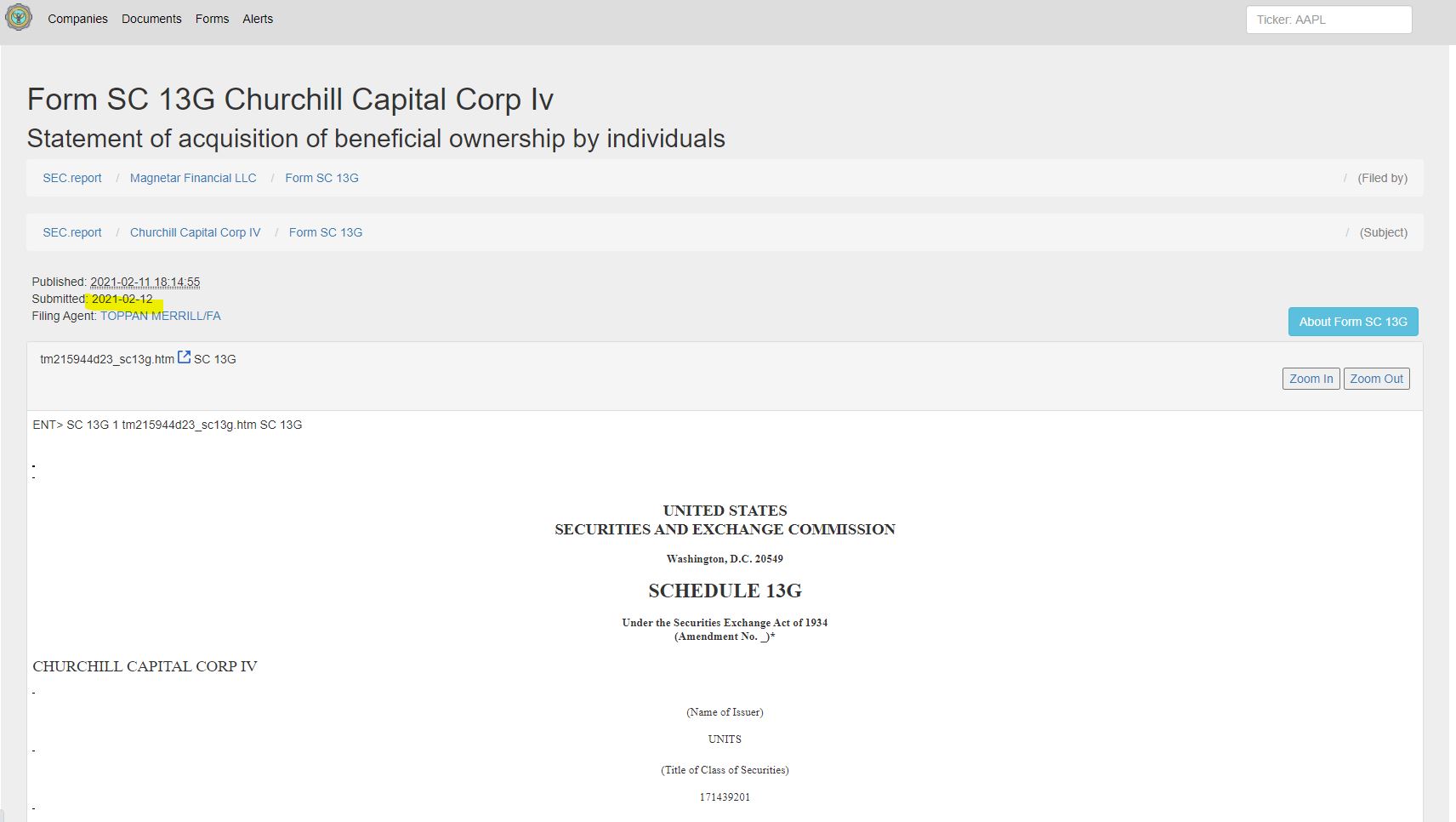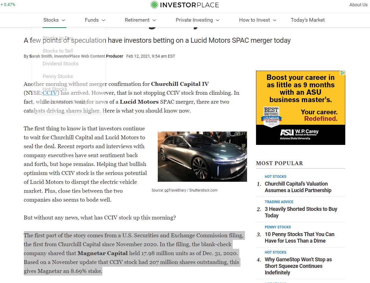 그리고 오늘 cciv 루시드 관련 기사들 중 여러 곳에서 오늘 cciv의 주가 상승 이유에 대해 이야기하는 기사들이 나왔고 인베스터 플레이스에서의 기사에서 오늘 아침 주가가 상승한 이유로 오늘 아침 SEC에 보고된 13G 서류에 magnetar financial이라는이라는 기관이 cciv에 대해 약 17.98 million의 주식을 소유하고 있다는 소식으로 이는 약 CCIV의 207 million 쉐어의 8.69% 차지하는 수량으로 이로 인해 투자자들의 투자심리를 자극했다는 점을 이야기하였습니다.개인적으로는 이러한 기관들의 투자는 루시드와의 합병 이전에 이루어진 투자로 $10대로 들어간 투자자들이기 때문에 이러한 기관들이 cciv의 투자로 루시드와의 합병과 주가에 큰 영향을 줄 소식이라고는 생각하지는 않지만 많은 투자자들에게는 cciv에 더욱더 긍적정인 반응을 일으켰다고 보입니다.