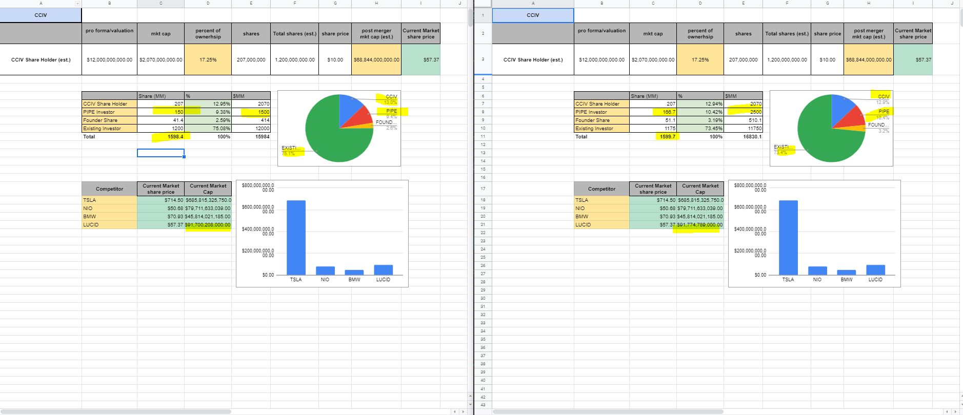 또한 합병 발표에서 PIPE의 투자가 주당 $15로 약 $2.5B이 추가되면서 이전에 예상한 합병 비율에서 살짝 벗어났지만 전체적으로 보면 전체적인 파이의 % 지는 그리 큰 차이가 없다고 보입니다.즉 여전히 CCIV 주주들의 루시드의 총주식의 보유량으로는 13%로 변화되지 않았고 단지 PIPE의 투자로 루시드의 기존 투자자들의 %가 조금 줄었다고 생각하시면 됩니다. 또한 결과적으로는 합병후 기업의 가치가 예상치보다는 약 $1B이 높게 층정됬지만 총주식의 량은 예상과 거의 일치하는 점을 확일할수 있었습니다.