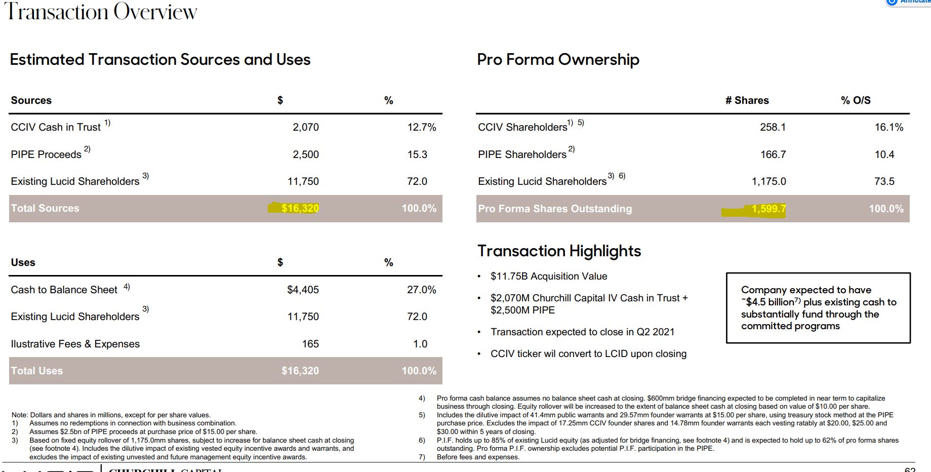 또한 합병 발표에서 PIPE의 투자가 주당 $15로 약 $2.5B이 추가되면서 이전에 예상한 합병 비율에서 살짝 벗어났지만 전체적으로 보면 전체적인 파이의 % 지는 그리 큰 차이가 없다고 보입니다.즉 여전히 CCIV 주주들의 루시드의 총주식의 보유량으로는 13%로 변화되지 않았고 단지 PIPE의 투자로 루시드의 기존 투자자들의 %가 조금 줄었다고 생각하시면 됩니다. 또한 결과적으로는 합병후 기업의 가치가 예상치보다는 약 $1B이 높게 층정됬지만 총주식의 량은 예상과 거의 일치하는 점을 확일할수 있었습니다.
