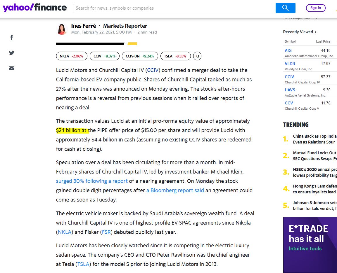 아마 오늘 애프터 아워에서 CCIV의 주가의 급락은 높은 차익실현도 있었다고 생각되지만 오늘 CCIV/루시드 합병 기사에서 PIPE의 $15 = $2.5B의 투자로 루시드의 가치가 $24B이 될거라는 이야기가 돌면서 아마 기업의 가치가 너무 높게 층적 됐다고 생각한 투자자들의 페닉 셀이 있었지 않았나 생각됩니다.