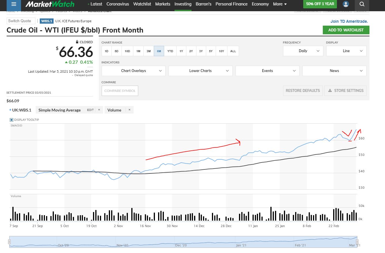 때문에 저 같은경우는 현재 부양책과 고용지표 호조로 주식 시장이 바닥을 찍고 다시 상승세를 탈지는 WTI CRUDE 오일 가격의 움직임을 보면서 인플레이션의 움직임을 지켜볼 예정입니다. 이는 여러가지 지표 중 오일의 가격 상승이 인플레이션과 연관되어 있기 때문입니다. 때문에 오일 가격 움직임을 지켜보며 시장에 대응할 예정입니다.