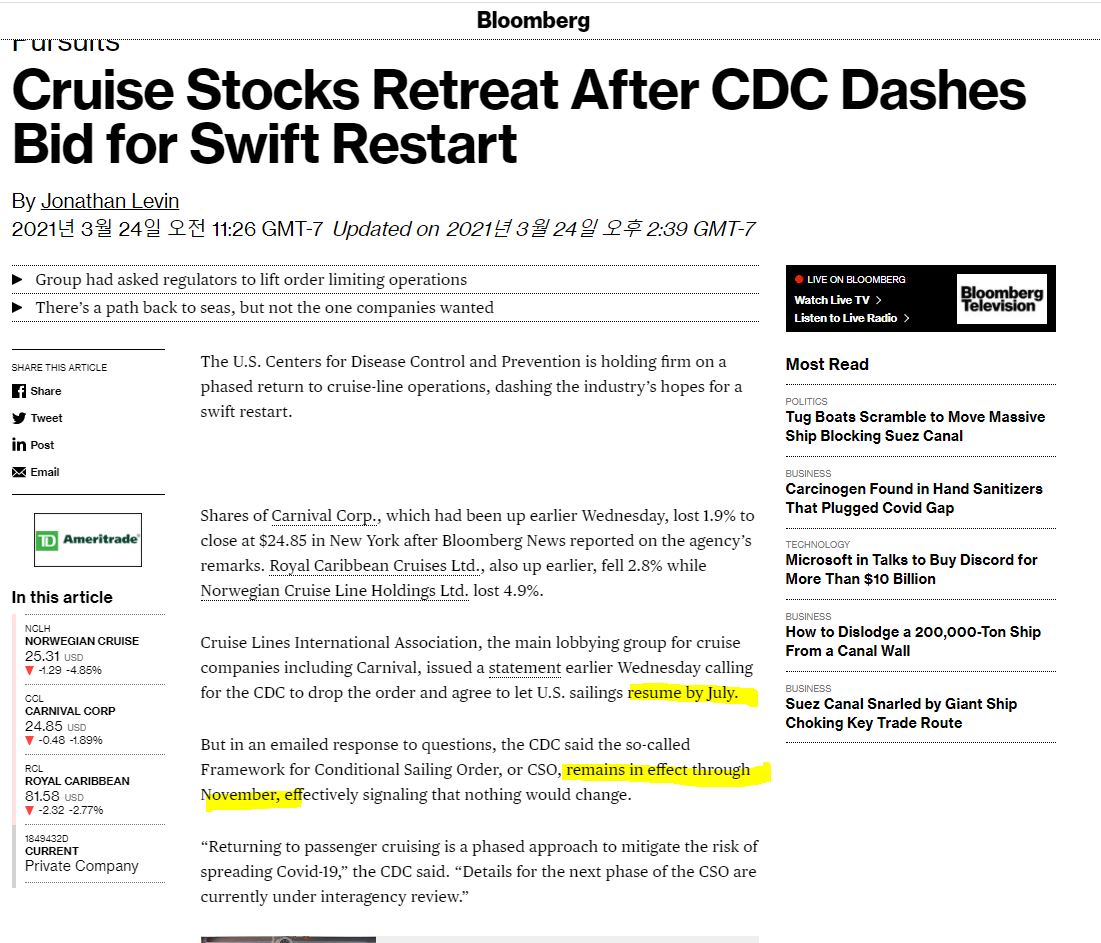 카니발과 같은 크루즈 기업들의 주가 하락에는 11월까지 크루즈 산업을 재개할수 없을것이라는 뉴스와 크루즈 산업 특성상 7월에 재개 될려면 적어도 준비기간이 90일 정도 걸리기 때문에 늦어도 다음주까지는 크루즈 산업이 7월에 재개할수 있을지 없을지 결정이 나와야 할것으로 알려져 있습니다.