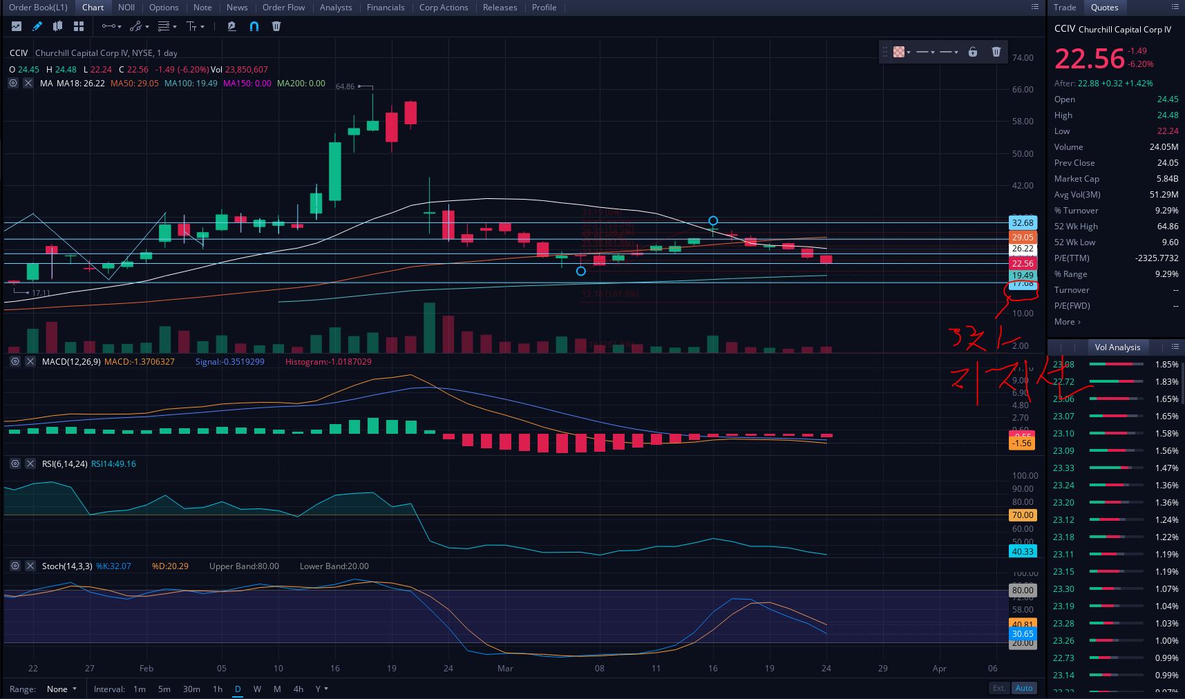 현재로는 강한 3차 지지선은 $17불 선으로 보여지면서 지속적으로 하락장을 보인다면 CCIV 주가는 $22달러에서 $17달러까지 추가적으로 하락할수 있는 가능성이 보여집니다. 과연 내일 장이 열면 주가가 2차 지지선에서 다시 리바운스하면서 상승할지 혹은 2차 지지선이 무너지면서 3차 지지선까지 추가적으로 하락할지 주위깊게 지켜보아야 할거 같습니다.
