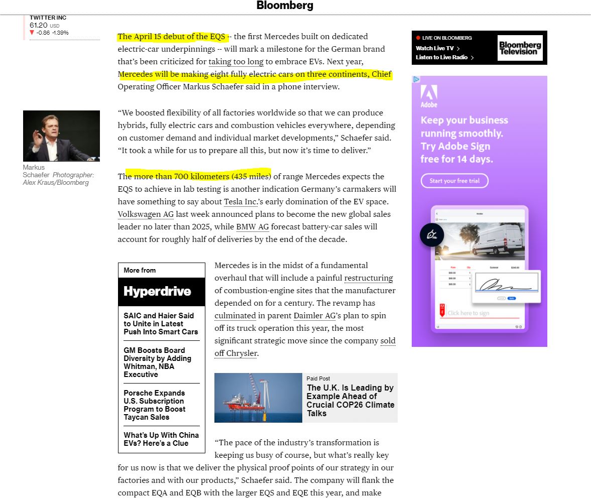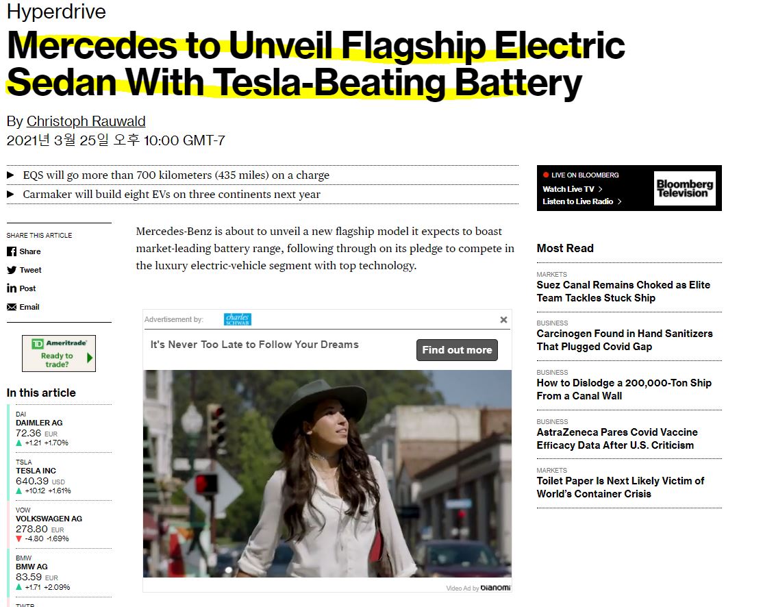 하지만 오늘 블룸버그에서 MERCEDES BENZ의 EV 자동차에 대한 아주 흥미로운 기사가 있기에 많은분들과 공유해볼려고 합니다.
