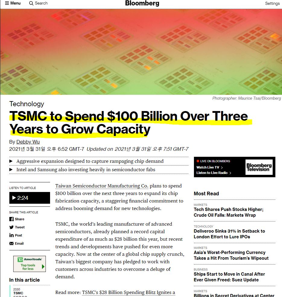 블룸버그에서 오늘 대만의 반도체 기업인 TSMC가 최근 발생한 반도체 공급 부족 사태 대응으로 3년 동안 $100B 달러의 투자로 반도체 생산 능력을 올린다는 소식입니다.