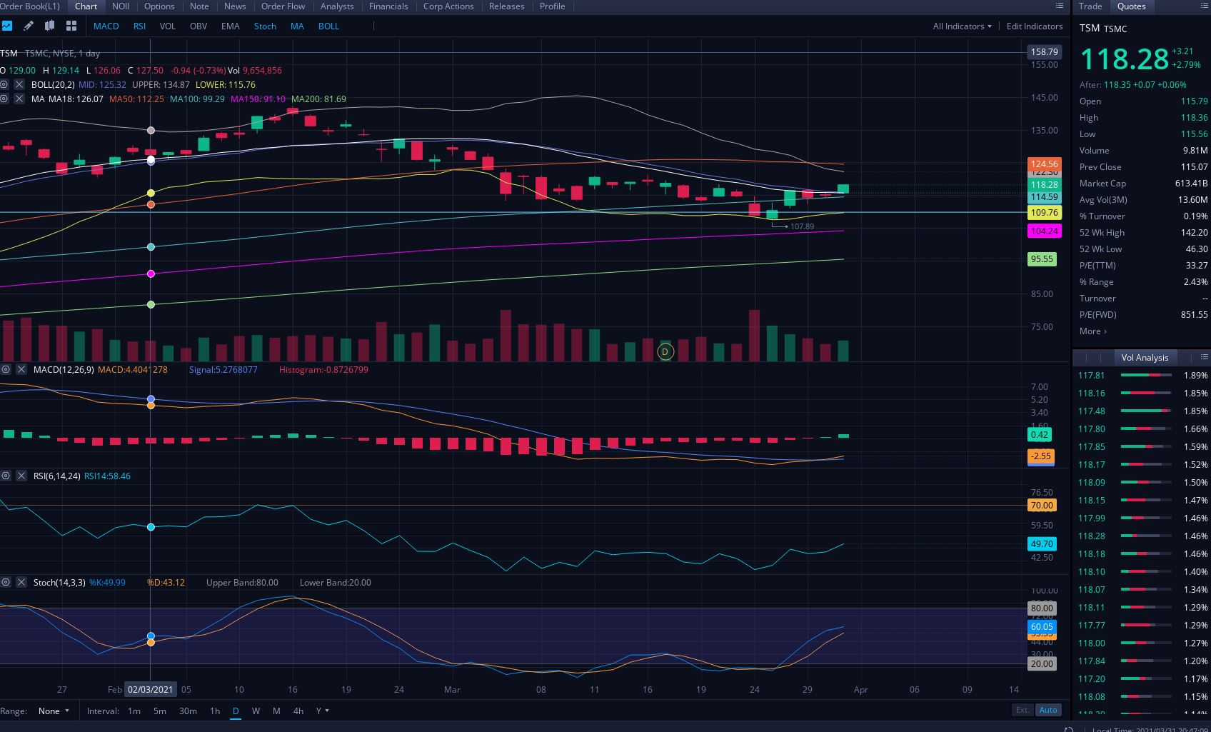 오늘 TSMC 주가는 전일대비 2.79% 상승한 118.28센트에 장을 마감하였으며 인텔은 최근 반도체 자체 생산 발표로 인해 주가가 상승한후 다시 조정을 받으며 현재는 전일대비 0.36% 상승한 $64달러에 장을 마감하였습니다.
