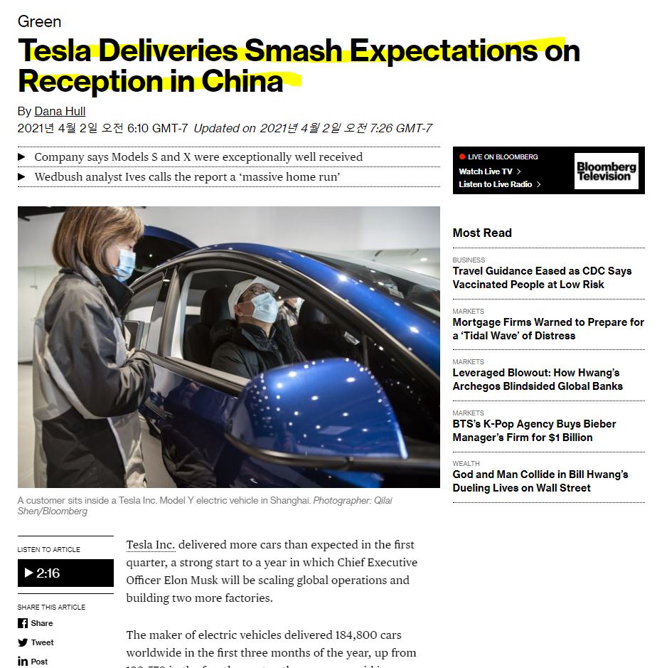 테슬라의 2021년 1분기 자동차 판매수가 많은 분석가들의 예측보다 높은 판매수를 기록하며 다음주 미국 주식 시장이 열리면 테슬라의 주가 상승을 기대시켜주고 있습니다.