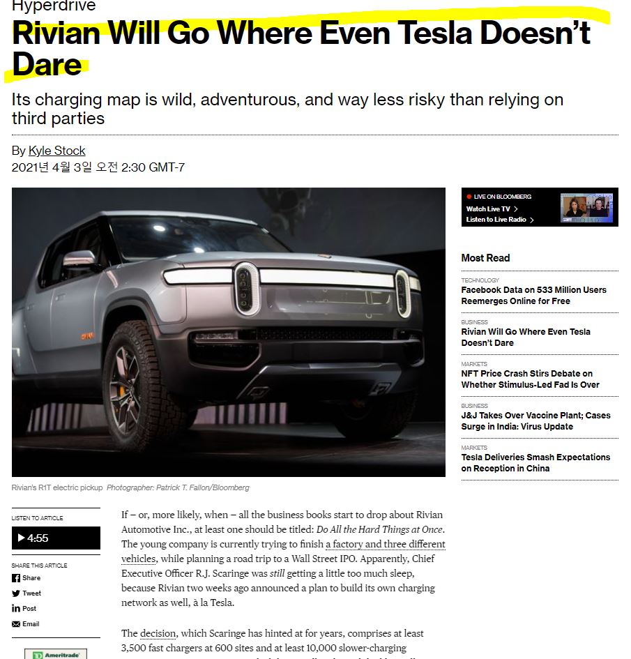 리비안 RIVIAN 아마존의 후원을 받는 전기차 기업 - 테슬라와 같이 리비안 자신들만의 전기차 충전소를 만들것으로 보임 루시드와는 다른 접근성