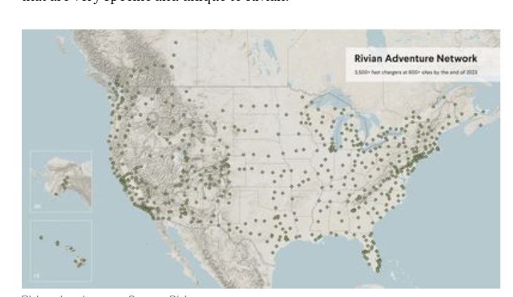 리비안은 대략 2024년까지 3500개의 급속 충전소를 600여곳 장소에 설치하고 대략 10000개의 기본 충전소를 캠프 사이트, 모텔, 하이킹 트레 일등 곳에 설치될 것으로 바라보고 있습니다.