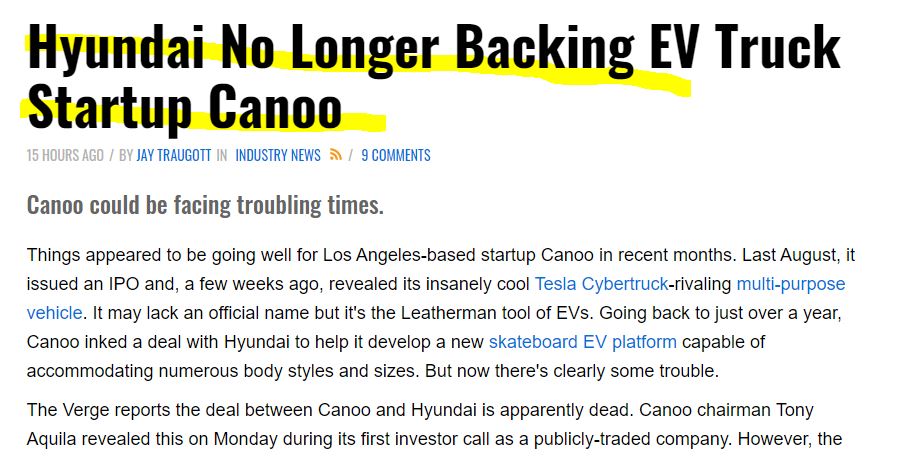 이미 전기차 스타트업 기업인 카누에 투자하신 분들이시라면 알고 계시듯이 카누와 현대의 협업이 사실상 물 건너가면서 안 그래도 루시드 모터스와 같이 현재까지 어떠한 실적도 없는 스팩주들의 높은 조정을 받고 있는 가운데 이러한 소식은 엎친데 덮친 격으로 카누의 주가를 큰 폭으로 하락시키는 소식이 되었습니다.