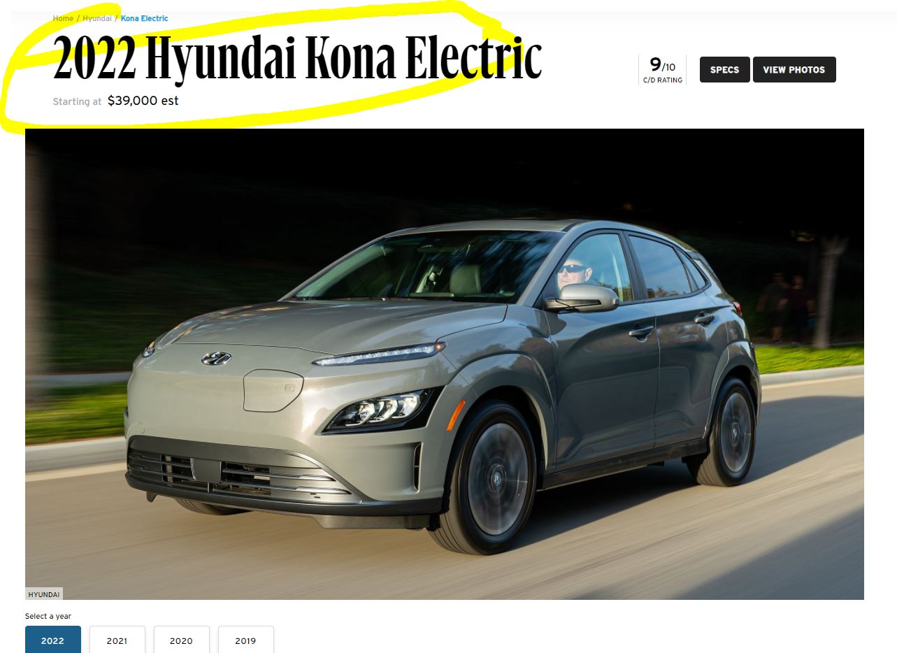 현대 코나 EV는 2022년 새롭게 디자인이 새로워 졌으며 외부 및 자동차 인테리어 부분도 살짝 이전 연도와는 바뀌었다고 합니다. 코나의 베이스 모델인 SEL와 LIMITED 모델이 있으며 가격은 SEL이 $39000 달러 그리고 LIMITED는 $46000로 알려져 있습니다.