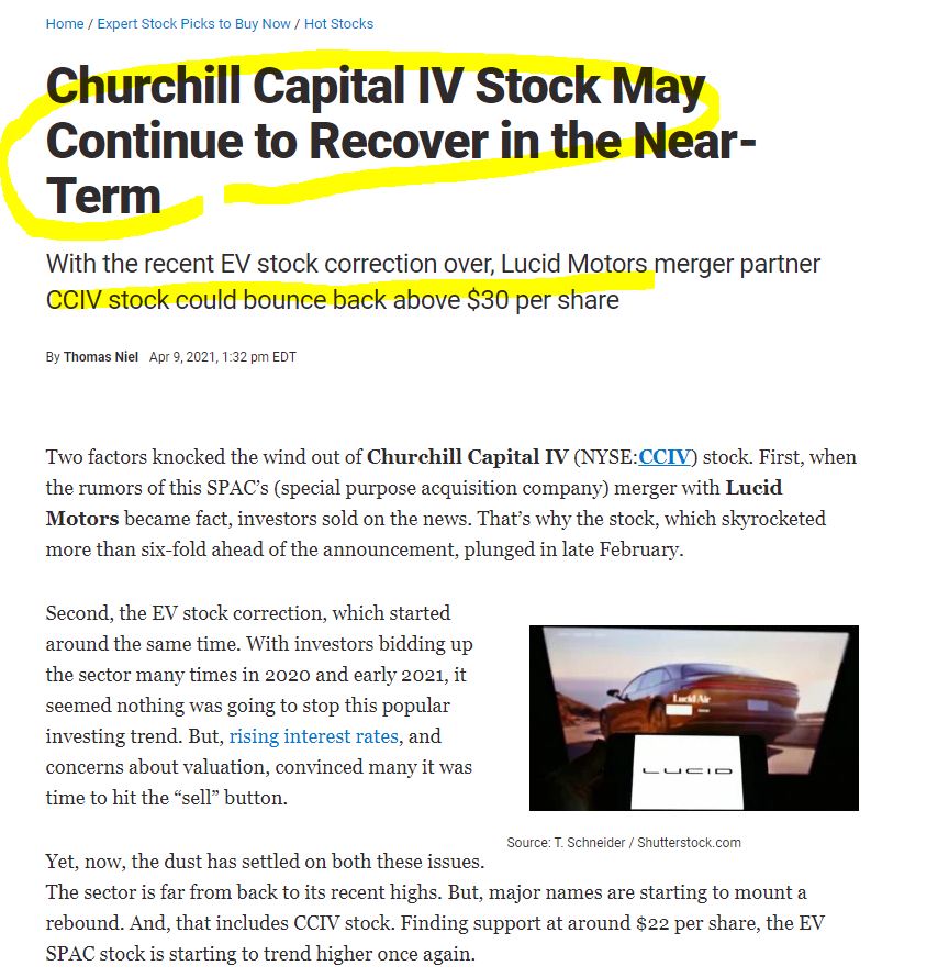오늘은 CCIV 루시드 관련해서 인베스터플레이스에 기사를 소개해드리려고 합니다. 기사에서는 최근 EV 전기차 섹터의 조정이 끝나면서 CCIV와 합병할 LUCID MOTORS의 주가가 $30 달러대로 다시 회복할 수 있을 거라는 기사였습니다.