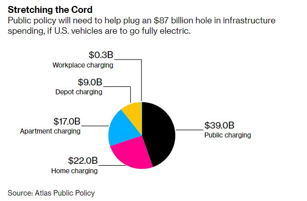 아래의 차트를 보면 공공 충전소, 주택, 아파트, 사무실 등 장소에 충분한 충전 설비를 가추기 위해서는 대략 $89 BILLION 달러가 필요할 것으로 내다보고 있으며 다행히도 친환경 정책으로 정부에서 현재 $174 BILLION의 예산안을 전기차 분야에 사용할것을 제의한 상황이기 때문에 이러한 충전소 설비 투자 자금은 정부에서 어느 정도 해결해줄 수 있을 것이라 보이고는 있습니다. 알려진 봐로는 발의한 $174 BILLION 달러에서 대략 $15 BILLION 달러가 전기차 충전소에 사용될 것으로 알려져 있습니다.