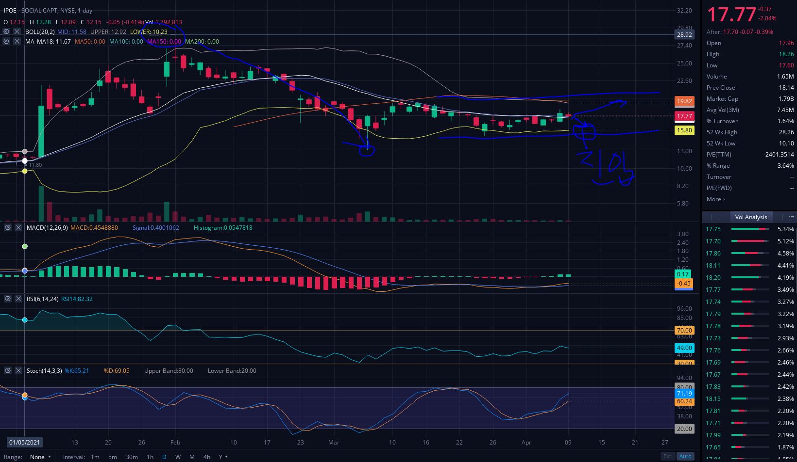 현재 IPOE 주가는 미국 주식 흐름에 따라 실적이 없는 스팩을 포함 성장주들이 높은 조정을 받고 있는 상황이라 한때 $28.26센트에 거래되었던 주가는 현재 $17 달러대에서 거래되고 있는 상황입니다.