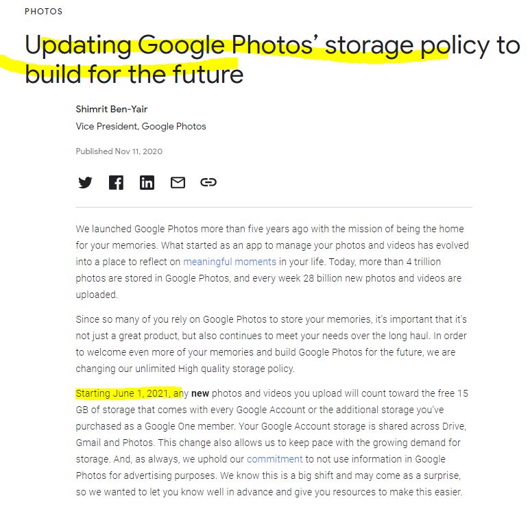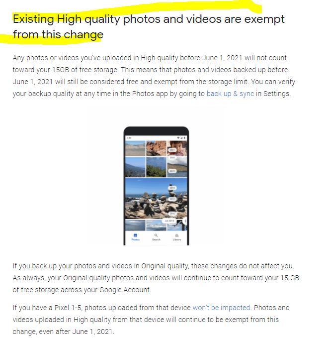 구글은 6월 1일전에 이미 GOOGLE 포토에 올라온 자료에 대해서는 15GB 용량 제한에서 면제된다고 이야기하며 오리지널 포토나 비디오는 이미 15GB 용량 제한에 포함되지만 고화질 사진 그리고 고화질 비디오에 대해서는 용량 제한에서 면제된다고 합니다.