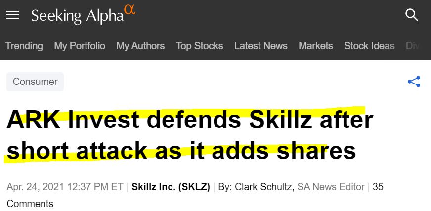 관련 기사 링크: seekingalpha.com/news/3685305-ark-invest-defends-skillz-after-short-attack-as-it-adds-shares