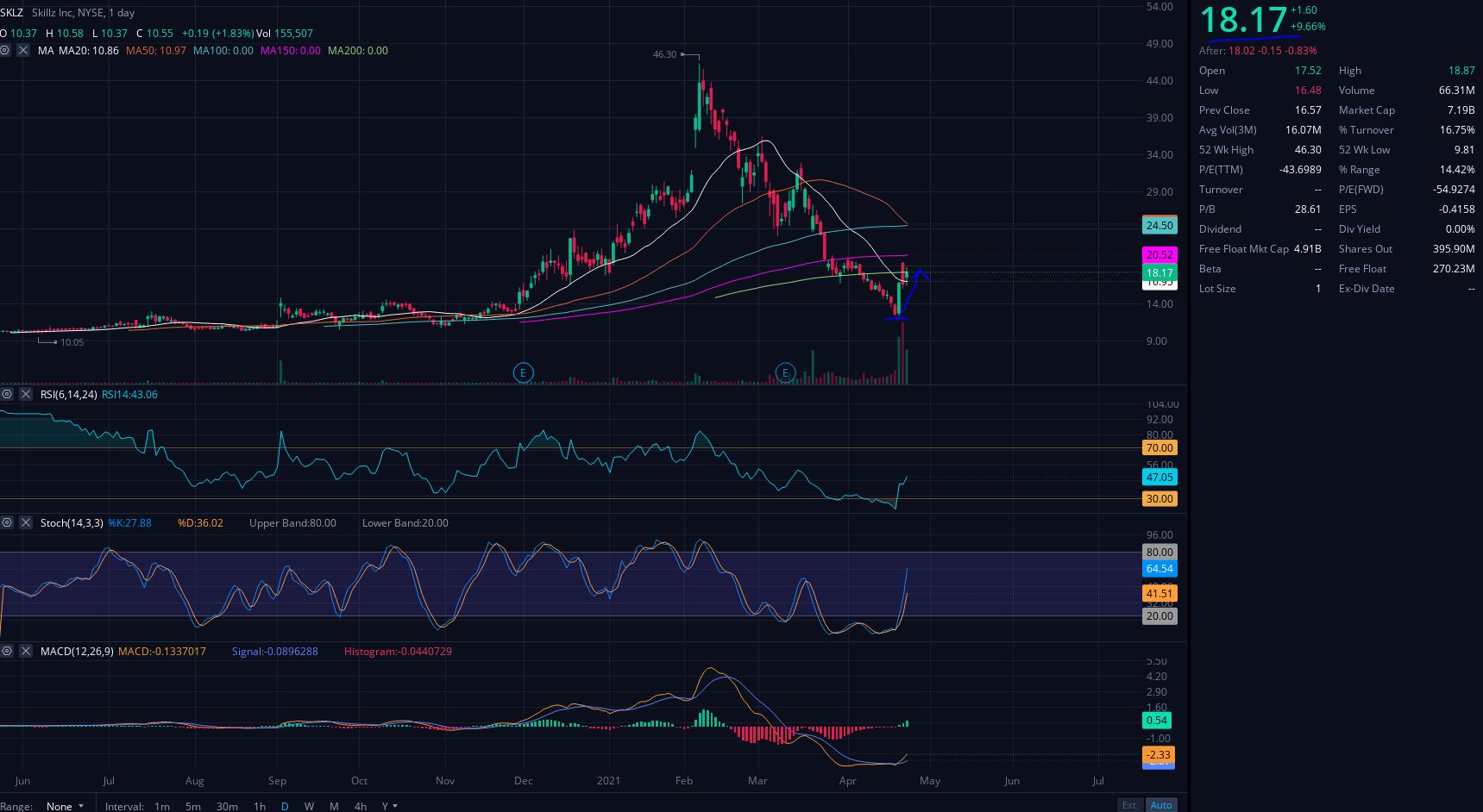 모바일 ESPORTS 플렛폼인 SKILLZ는 한동안 많인 투자자들에게 뜨거운 관심을 보였던 종목 중 하나였습니다. 스킬즈의 주가는 한때 주당 $46 달러에 거래되면서 짧은 시간 급상승하는 모습을 보여주었지만 최근 몇 주간 CCIV를 포함 스펙 혹은 성장주들의 높은 조정을 받으면서 SKILLZ의 주가는 $12달러까지 하락하는 모습을 보여주었습니다.