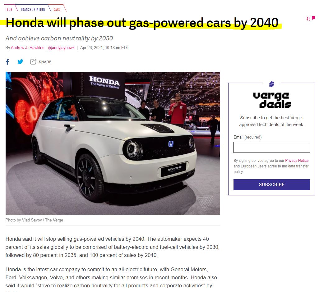 토요타, GM, FOR, VOKSWAGEN, VOLVO 등 최근 세계적인 연소 자동차 업계들이 자신들의 시대 변화에 맞혀 자신들의 연소 차를 단계적으로 중단하고 전기차화에 공격적으로 투자할 것이라 밝혔으며 혼다는 이들 중 가장 마지막으로 자신들의 전기차화 계획을 발표하였습니다.