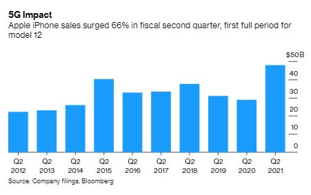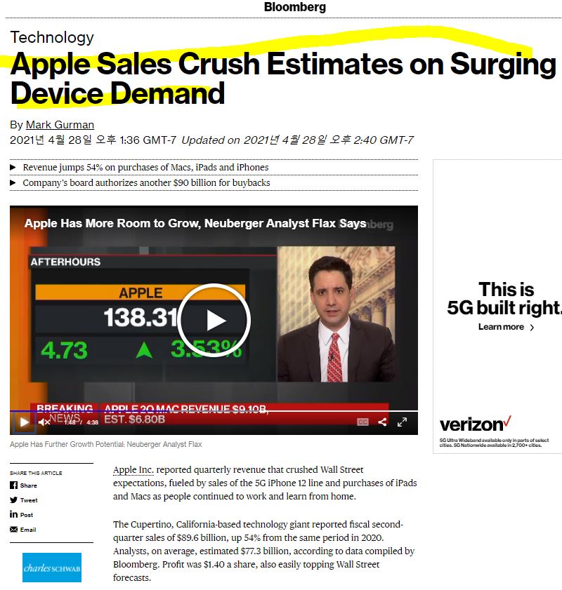 애플은 이번 회계 연도 2분기 매출이 $89.6 BILLION 달러로 2020년 같은 기간과 비교해 약 54%나 증가한 수치입니다.