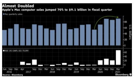 또한 애플의 아이패드 수익은 $7.8 BILLION 달러로 예상치였던 $5.65 BILLION 달러를 넘어섰고 애플의 맥 컴퓨터의 판매는 $9.1 BILLION 달러로 예상치인 $6.8 BILLION 달러보다 높았습니다.