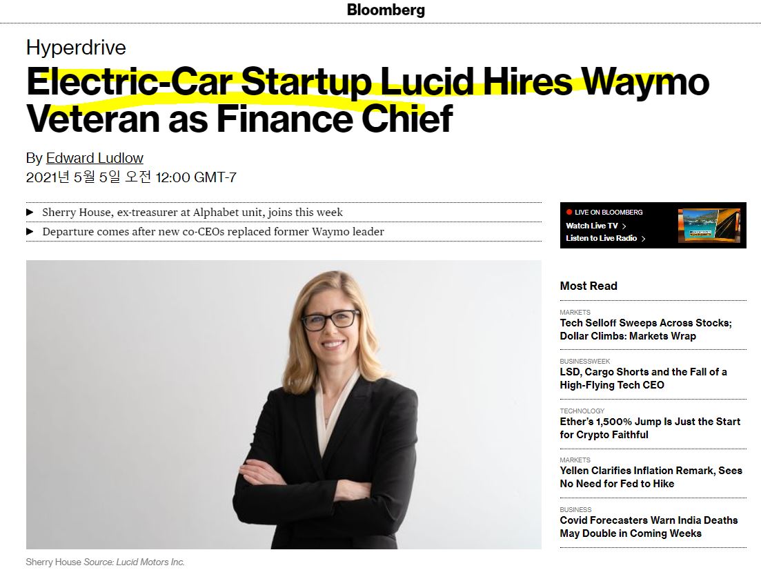 블룸버그에 따르면 CCIV LUCID MOTORS에 전 구글의 자율 주행차 WAYMO 재무 책임자였던 Sherry House가 루시드에 수석 재무 관리자 CFO로 이번 주부터 합류한다는 소식이 들려왔습니다.
