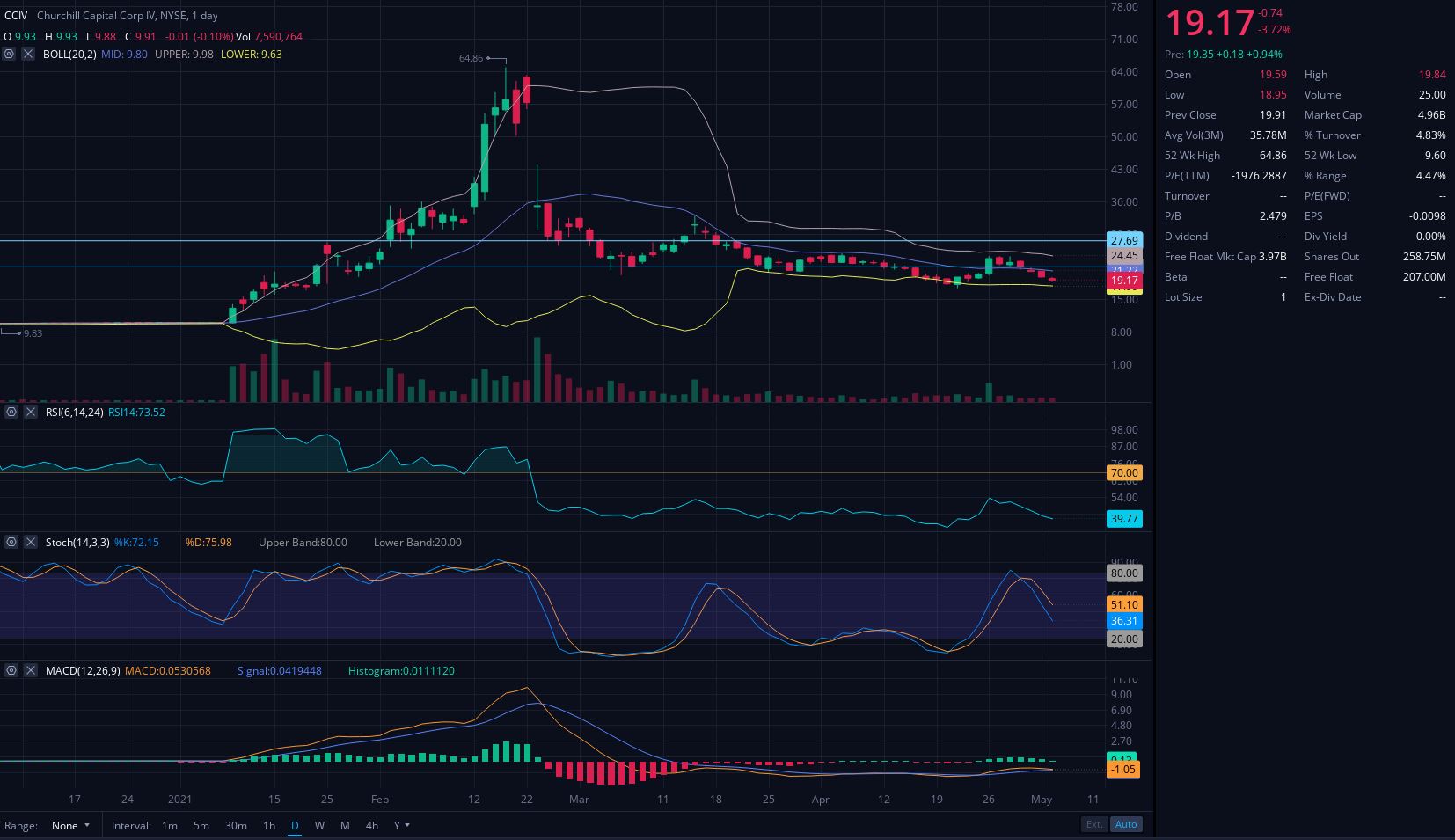 CCIV의 주가는 월요일 3.72%나 빠지면 $19.17에 장을 마감하였으며 CCIV 뿐만 아니라 많은 성장주 그리고 기술주들이 약세를 보여주는 하루였습니다. 이러한 약세장에는 오늘 미국 재무부 장관인 쟈넷 옐런이 미국의 경제가 과열되지 않게 하기 위해서 금리가 상승해야하 할 수도 있다고 밝히면서 미국 주식 시장에 큰 영향을 주었다고 보입니다.