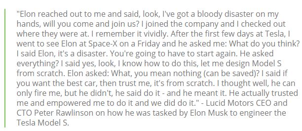 루시드의 피터 롤린스는 이전에 인터뷰에서 밝힌봐로는 자신이 테슬라에 고용된 배경으로 일론 머스크가 위기의 테슬라를 구해내고 모델 S의 출시 때문이라고 밝힌 적 있습니다.