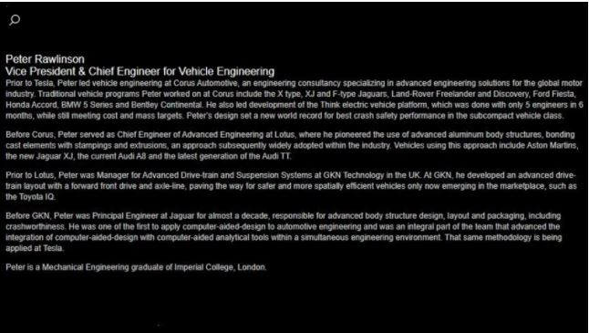 기사에서는 또한 이전 테슬라의 홈페이지에서 피터 롤린스에 대해 VP 엔지니어 그리고 수석 엔지니어라고 소개되어 있는 것도 찾아내었습니다.