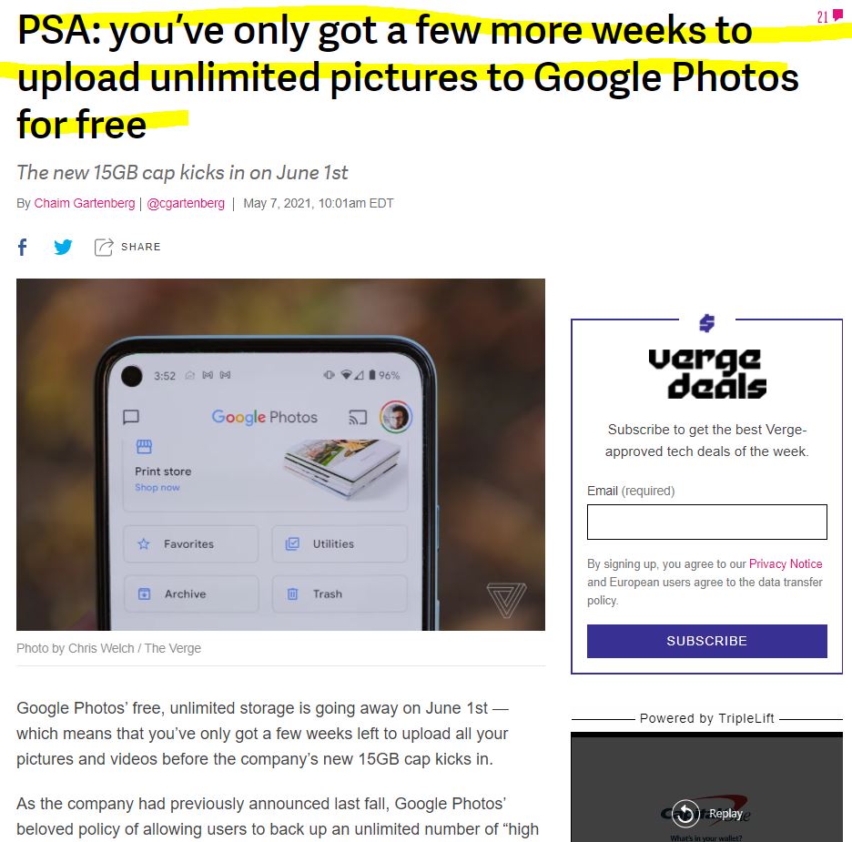참고 관련 기사 링크: www.theverge.com/2021/5/7/22424528/google-photos-storage-limit-date-15gb-cap-deadline
