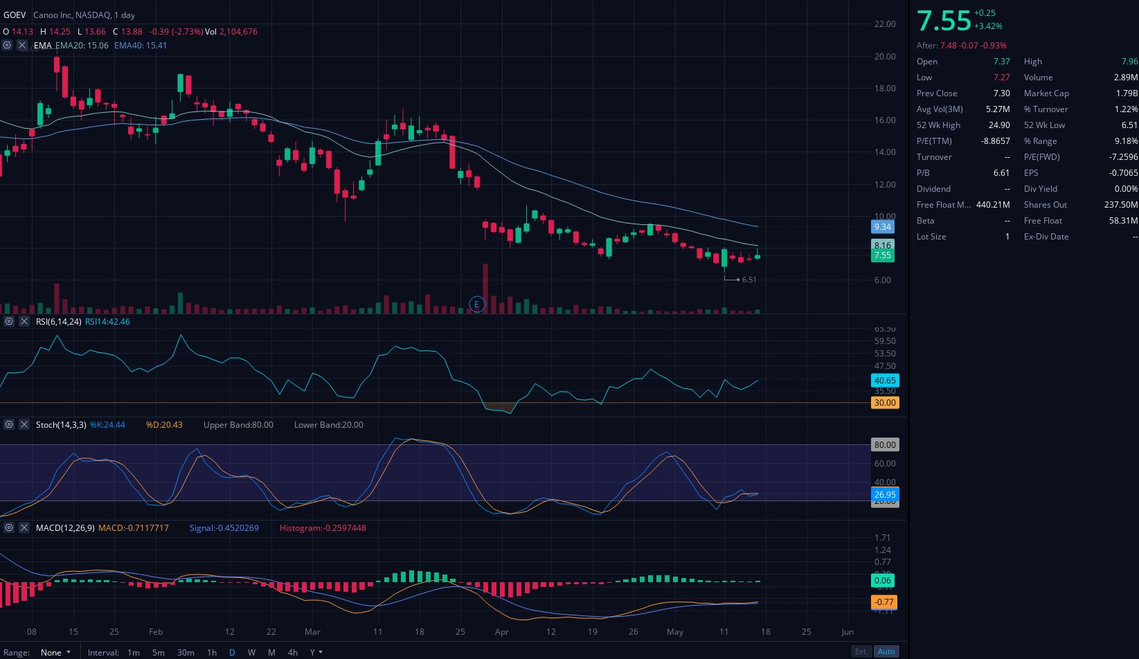 오늘 GOEV CANOO의 주가 3.42% 상승한 $7.55 달러에 장을 마감하였습니다.