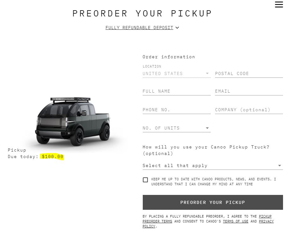 오늘 GOEV CANOO의 주가 상승한 이유로는 카누가 발표한 새로운 소식 때문이라고 생각됩니다. 오늘 카누는 자신들의 3가지 EV 자동차 모델에 대한 사전 주문을 (프리오더)를 받기 시작할 것이라고 밝혔으며 단 보증금 $100 달러로 CANOO의 LIFESTYLE VEHICLE, MULTI-PURPOSE DELIVERY VEHICLE, PICKUP TRUCK을 사전 주문할 수 있게 되었습니다.