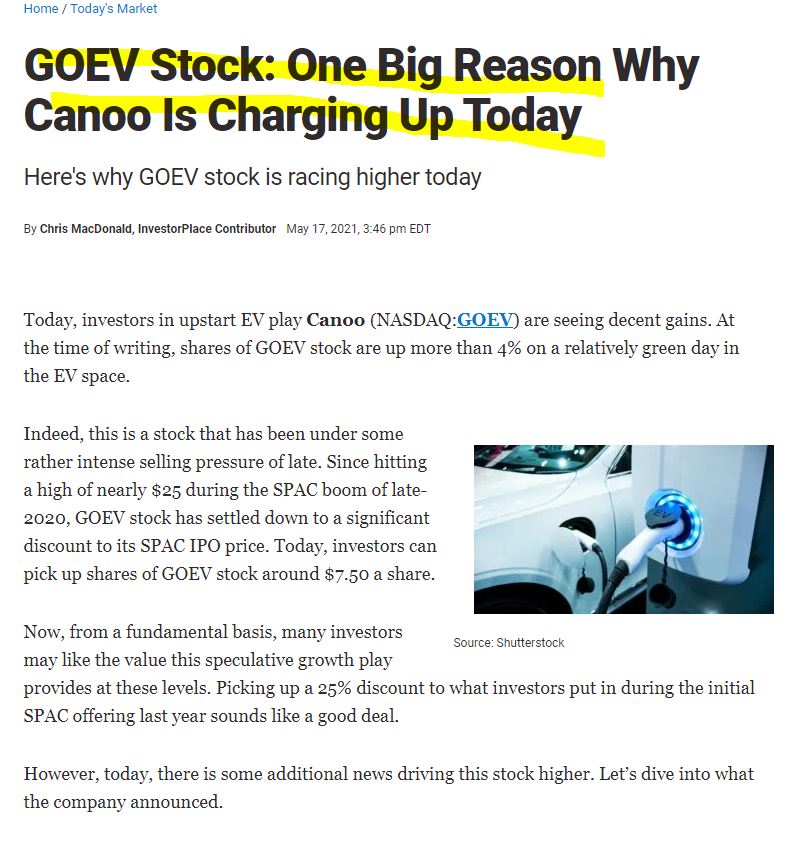 투자자들 사이에서 스팩이 상당히 뜨거웠던 시절 특히 EV 전기차 분야의 스팩 시장은 그야말로 뜨거운 관심을 받으며 CCIV 루시드 모터스와 못지않게 GOEV CANOO는 새로운 방식으로 EV 전기차를 시장에 소개하며 투자자들에게 높은 수익을 내줄 수 있을 것처럼 보였습니다.
