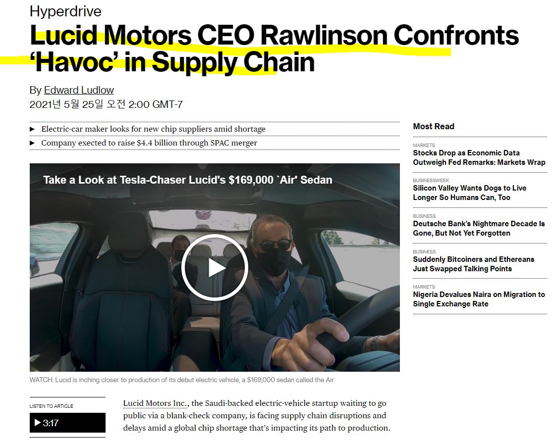 참고 관련 기사 링크: https://www.bloomberg.com/news/articles/2021-05-25/lucid-motors-ceo-rawlinson-confronts-havoc-in-supply-chain