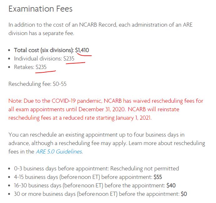 대부분 건축 사무소들은 직원들에게 건축사 자격증을 따는것을 장려하고 있으며 대부분 자격증에 필요한 서재나 교육 자료를 재공 하며 개인적으로 지불하기 약간 부담스러울 수 있는 7개의 (캘리포니아 기준) 자격증 시험비를 사무소에서 부담하기도 한다. 하지만 대부분 건축사 자격증 시험에 패스했을 경우에만 시험비를 회사에서 부담해주며 불합격했을 때에는 자기의 사비로 지출해야 한다. 2021년 기준 총 6개의 건축사 시험 중 1개당 시험비는 $235 달러이며 6개 모두 합치게 되면 총 $1410 달러를 지출하게 된다. 또한 건축사 시험의 합격률이 높은 시험이라면 그마나 위안을 삼을 수 있겠지만 합격률은 대략 50-60%로 그리 높은 편이 아니며 재시험을 보기 위해서는 또다시 $235 달러를 부담해야 한다. 또한 대부분 건축사 시험을 준비하는 사람들은 모든 시험을 통과하기 전까지 여러 번 불합격하기도 한다. 이 때문에 건축사 시험을 준비하는 과정에서 개인적으로 망설여지는 부분이기도 하다.