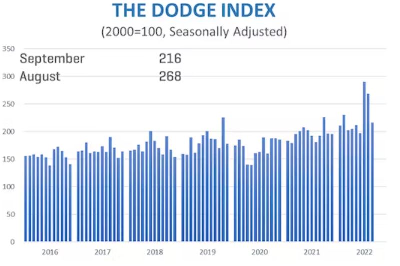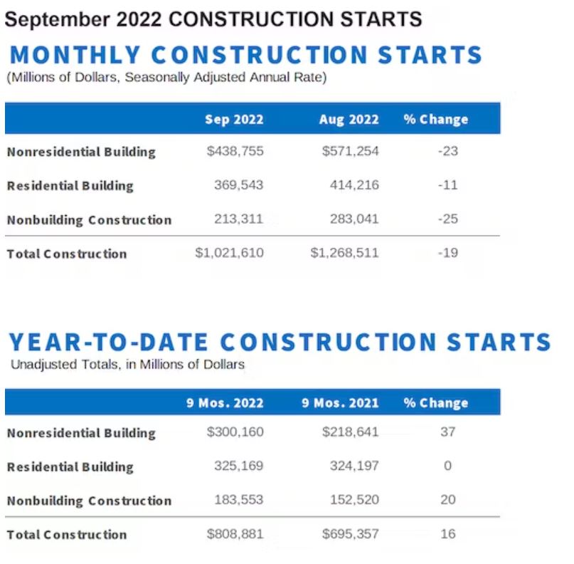 인플레이션과 전쟁으로 인해 세계적인 경제가 내년 리세션이 올 수 있다는 우려 속에서 dodge construction network (DCN)의 최신 데이터에 따르면 9월 건설 착공 건수가 8월 대비 약 -19%가 감소한 것으로 나타나며 7월 48% 증가 후 2개월 연속 감소세를 기록하였습니다.