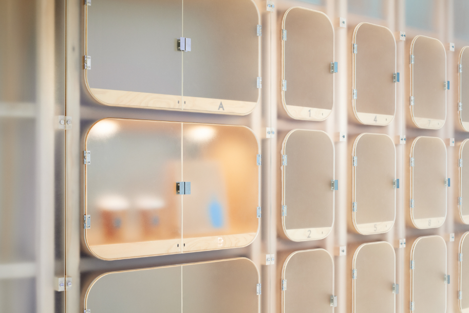 비대면 간접 고객 응대에서 놓칠수 있는 부분들을 설계사는 따듯함을 간접적으로 전달할 수 있는 부분에 초점을 맞추어 건축 자재는 나무를 사용하였으며 문이 열리고 닫히는 곳은 표면은 프로스팅 처리한 아크릴을 사용하면서 빛이 은은하게 스며들도록 하였습니다.