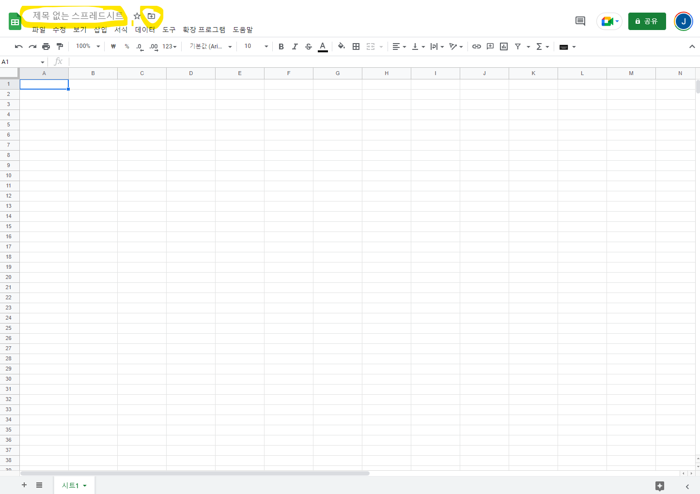 - 화면 좌측 상단 모서리에 기본값인 "Untitled spreadsheet" 혹은 "제목 없는 스프레드시트"를 클릭하시면 원하는 이름을 입력하실 수 있습니다.