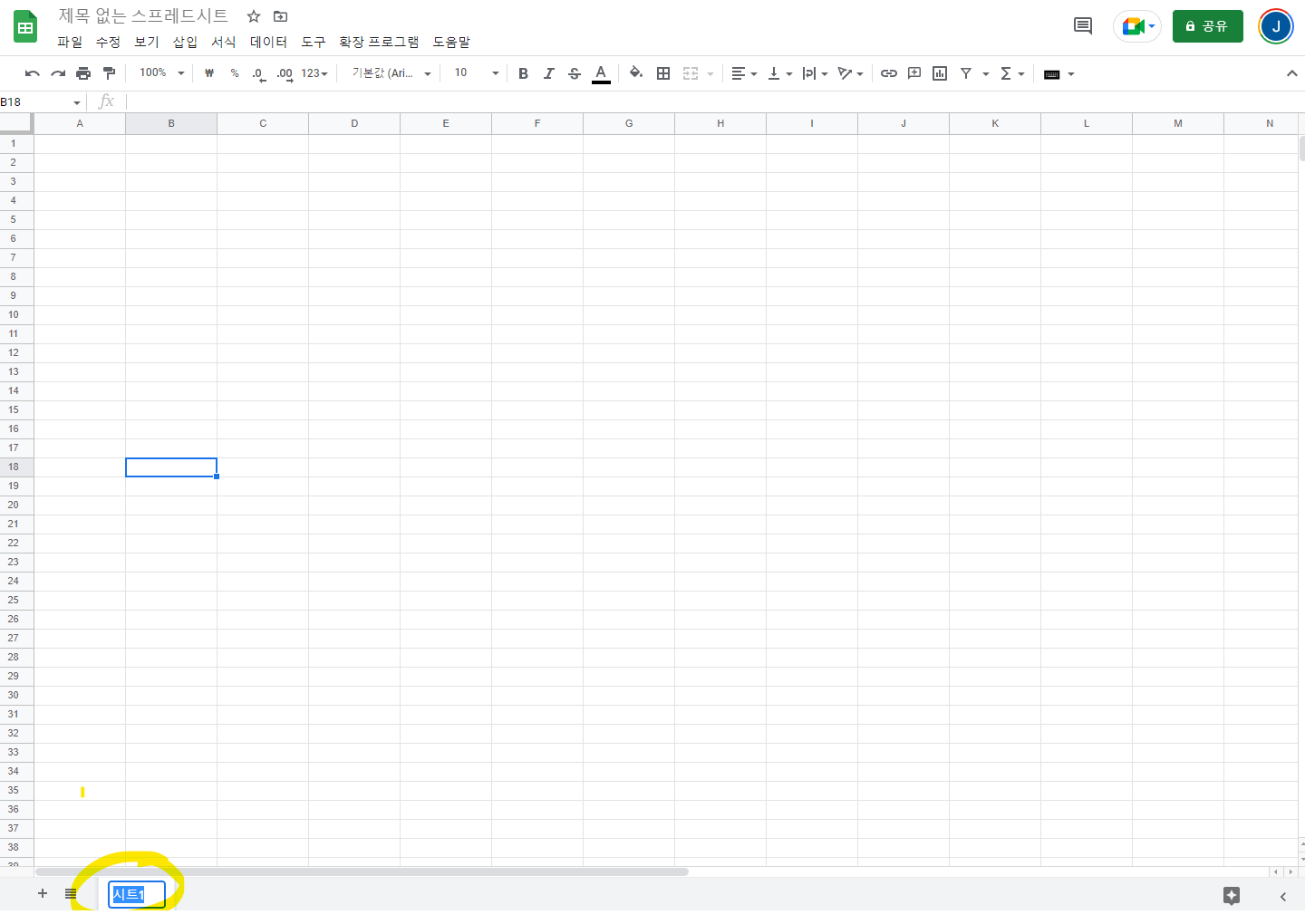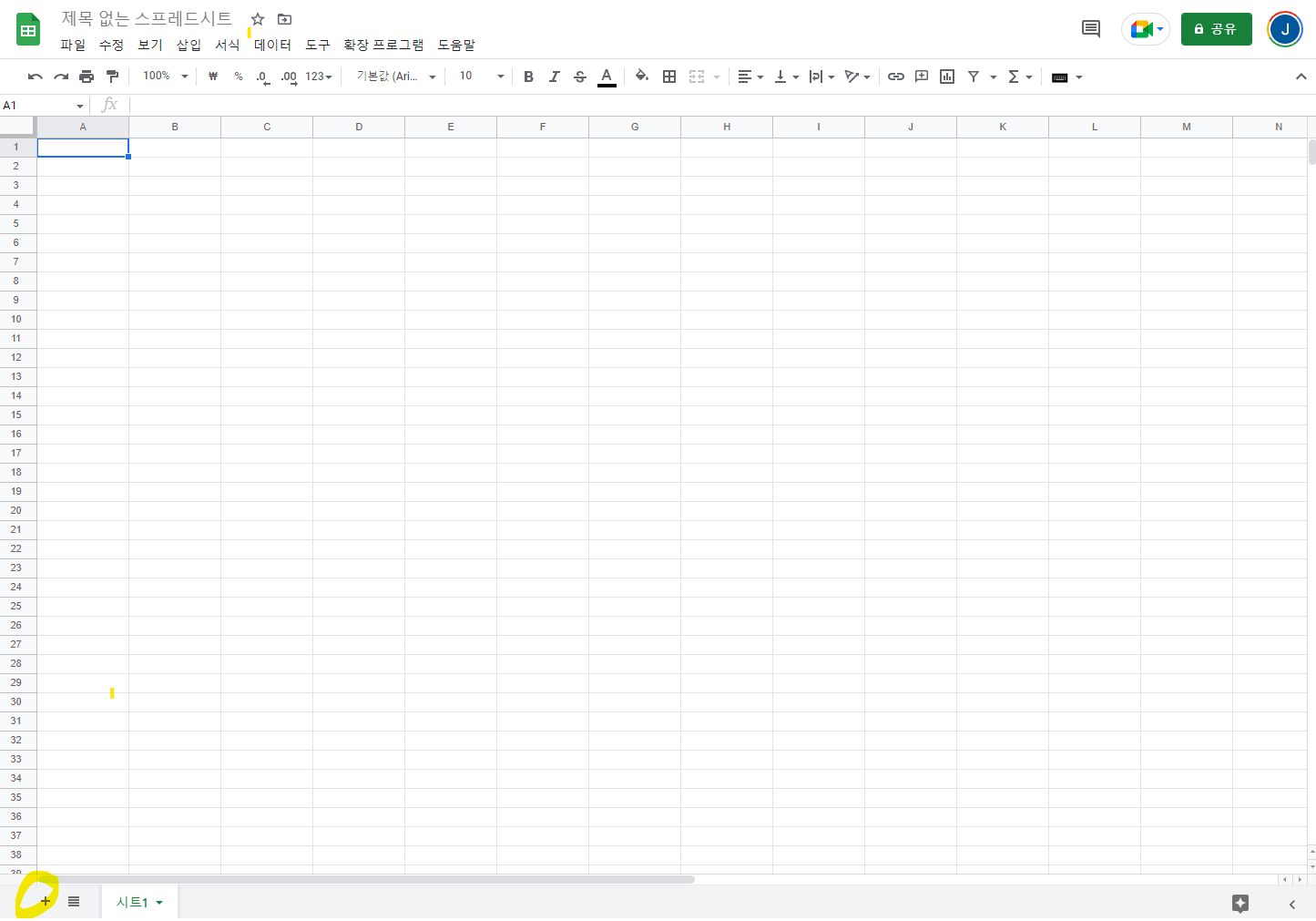 - 화면 아래에 "시트1"이라고 되어있는 탭옆에 + 아이콘을 클릭하시면 새로운 시트가 "시트 1" 옆에 추가됩니다.