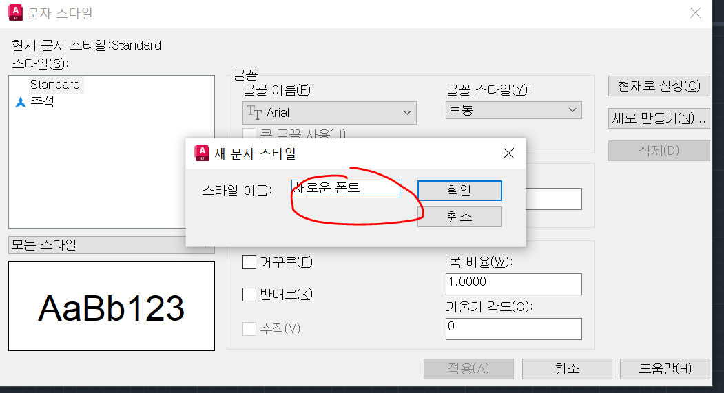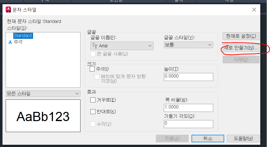 "문자 스타일 관리" 대화 상자에서 "새로 만들기" 버튼을 클릭하여 새 문자 스타일을 만듭니다. 이렇게 하면 사용할 폰트를 지정할 수 있는 "새 문자 스타일" 대화 상자가 열립니다.
