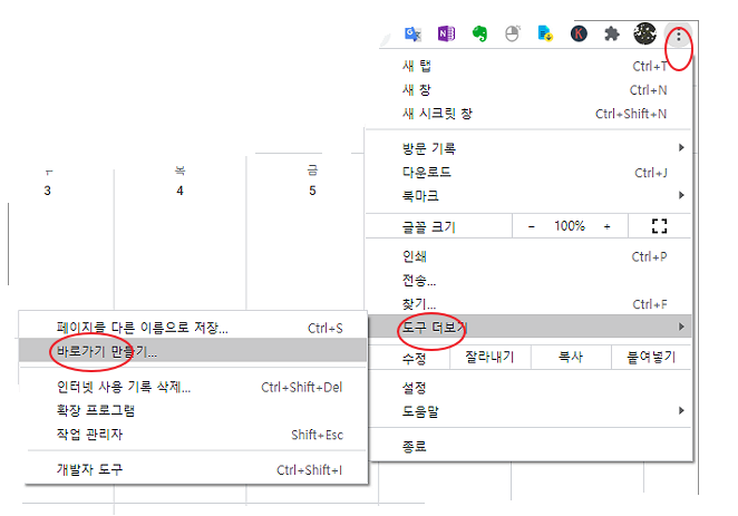 다음으로는 구글 크롬 브라우저를 사용하신다면 아래와 같이 더보기를 클릭 그리고 도구 더 보기를 선택하셔서 바로가기 만들기를 선택해서 이름을 설정하신 후 창으로 열기를 체크 해준후 만들기를 선택합니다.