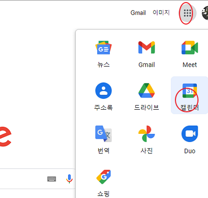 조금 수동적으로 설정 하는 방법으로는 구글 계정에 로그인하신 후 오른쪽 상단 아이콘을 클릭해서 캘린더를 선택해 주셔서 구글 캘린더로 들어가 줍니다.