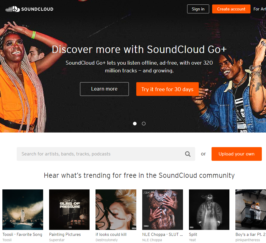 사운드 클라우드는 개인이 자신의 음악을 전 세계에 공유할수 있는 플랫폼으로 SoundCloud를 사용하면 인기 아티스트의 노래에 액세스 할 수 있을 뿐만 아니라 떠오르는 아티스트 및 독립 제작자의 음악을 검색하고 다운로드할 수도 있습니다.