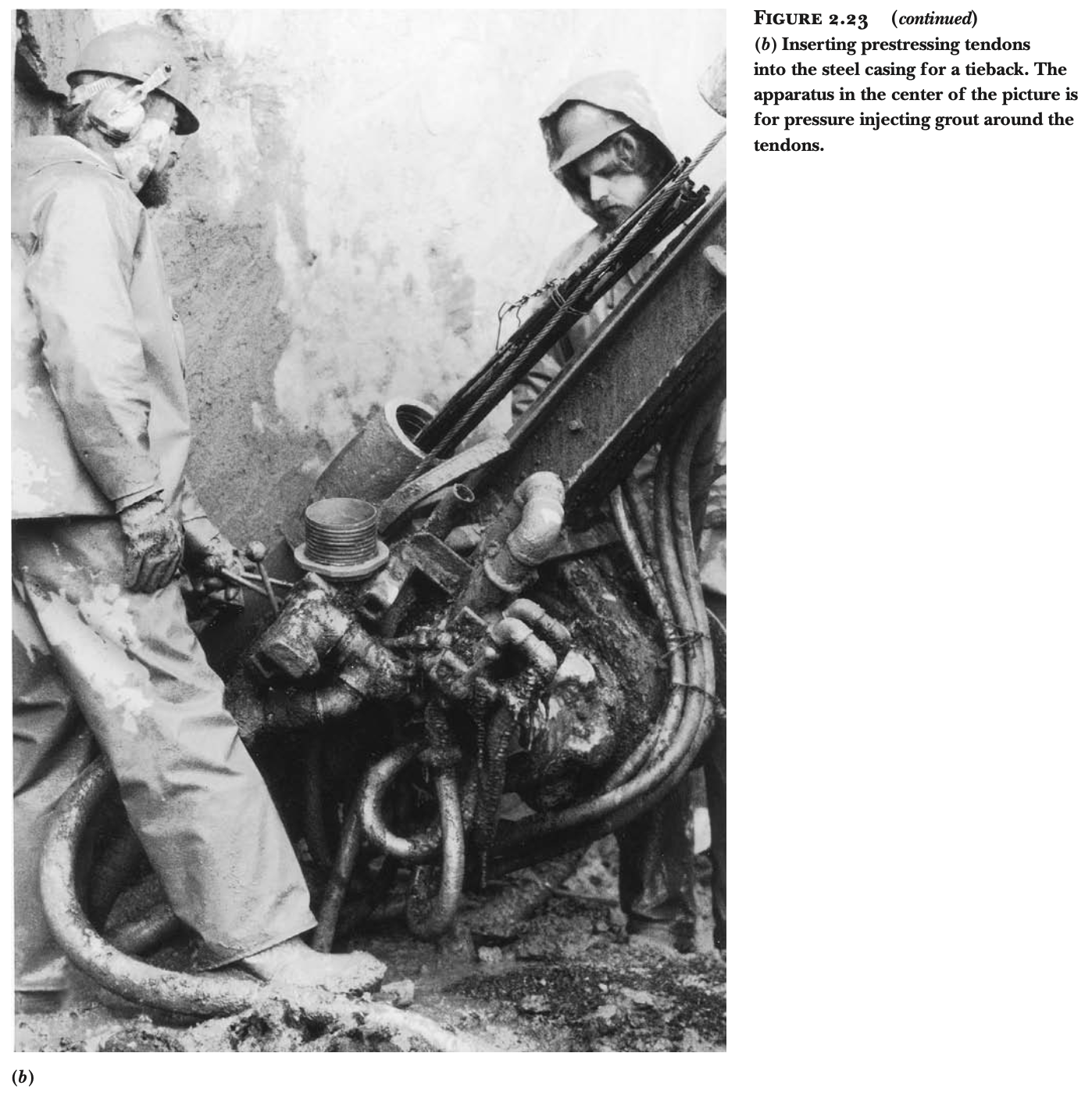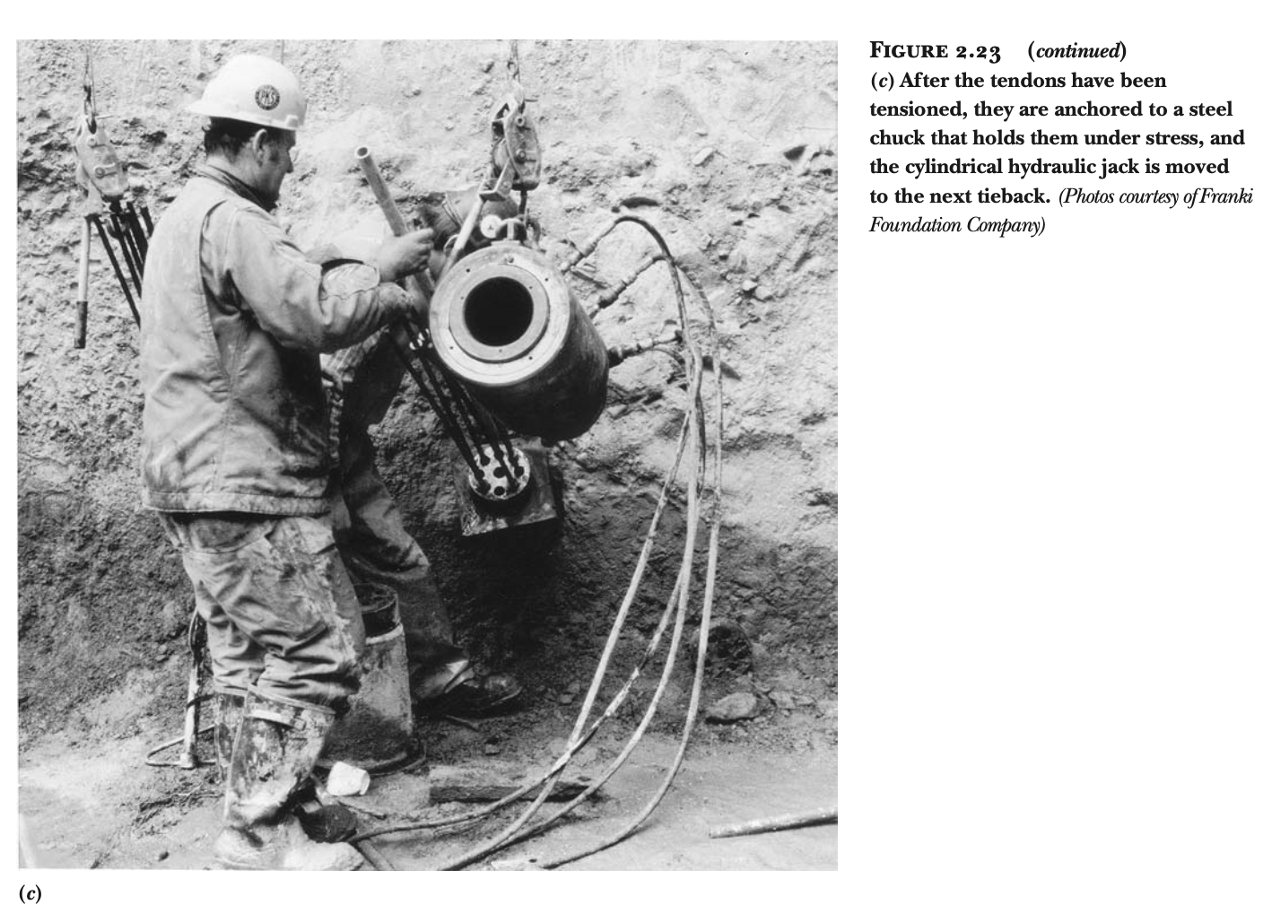 지반 조건이 허용한다면, 개방된 굴착을 유지하면서 차수벽을 지지하기 위해 브레이스 대신 타이백(tieback)을 사용할 수 있습니다. 각 웨일러 높이에서, 차수벽과 주변 토양을 통과해 암반이나 안정된 토층까지 구멍을 일정 간격으로 뚫습니다. 그런 다음 강철 케이블이나 텐던(tendon)을 이 구멍에 삽입하고, 그라우팅하여 암반이나 토양에 고정시킨 후, 유압 잭으로 팽팽하게 당겨 (포스트 텐션) 웨일러에 고정합니다 (그림 2.22-2.24 참조).